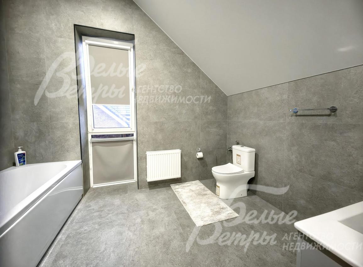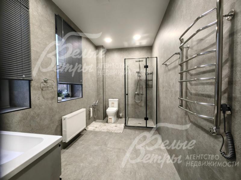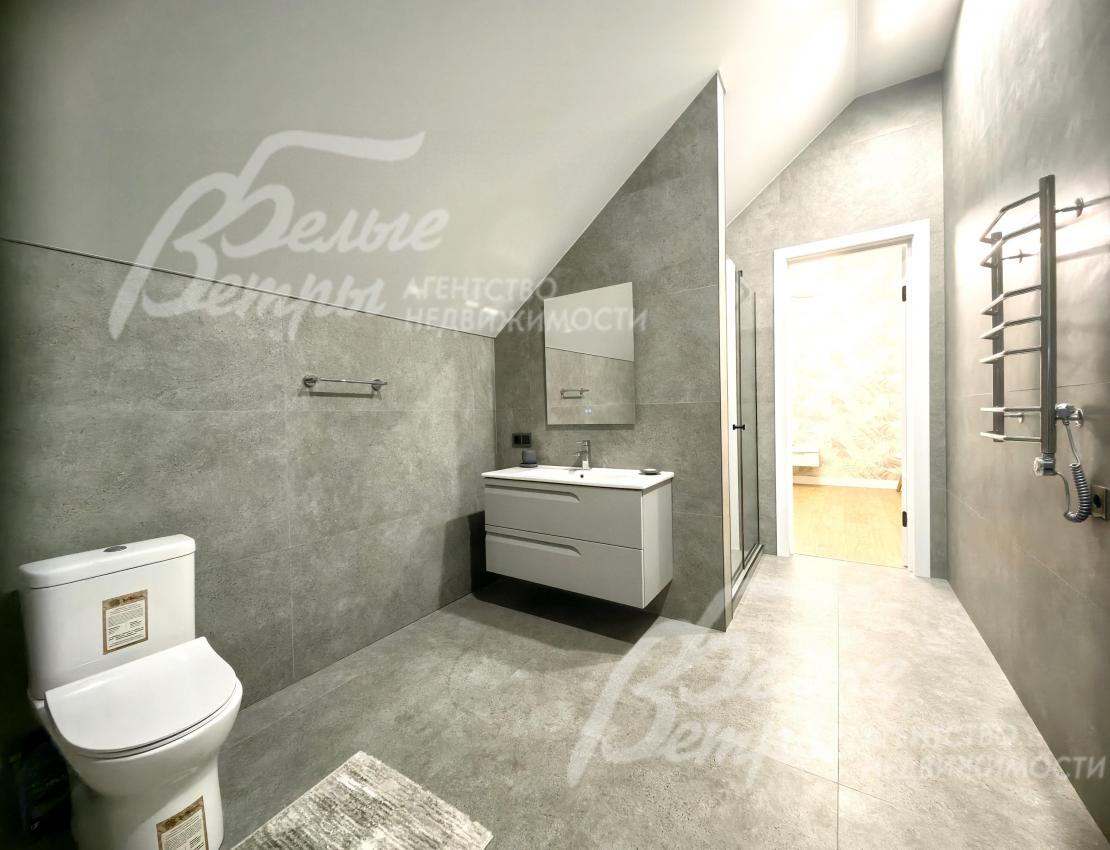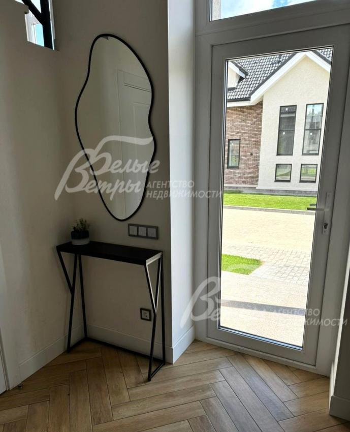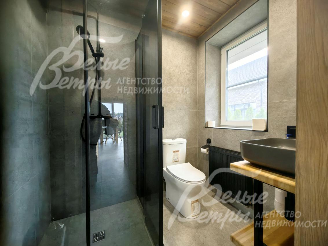 Описание внутренней отделки: Стильная отделка в современные пастельных тонах: стены в основном светло-серого цвета, высокие потолки, много света, ярких элементов интерьера, в том числе черного цвета (смесители, души, радиаторы отопления, другие). Все окна в доме панорамные. В санузлах - плитка до потолка, много декора. Зеркала в солидных рамах. Двери филенчатые, белого цвета. Качественная стильная сантехника, отдельно стоящая ванна, большие душевые кабины с трапами. Стальные панельные радиаторы. Лестничный марш на бетонном основании шириной 112 см, ступени из керамогранита, 32*18 см, ограждение металлическое с деревянным поручнем.