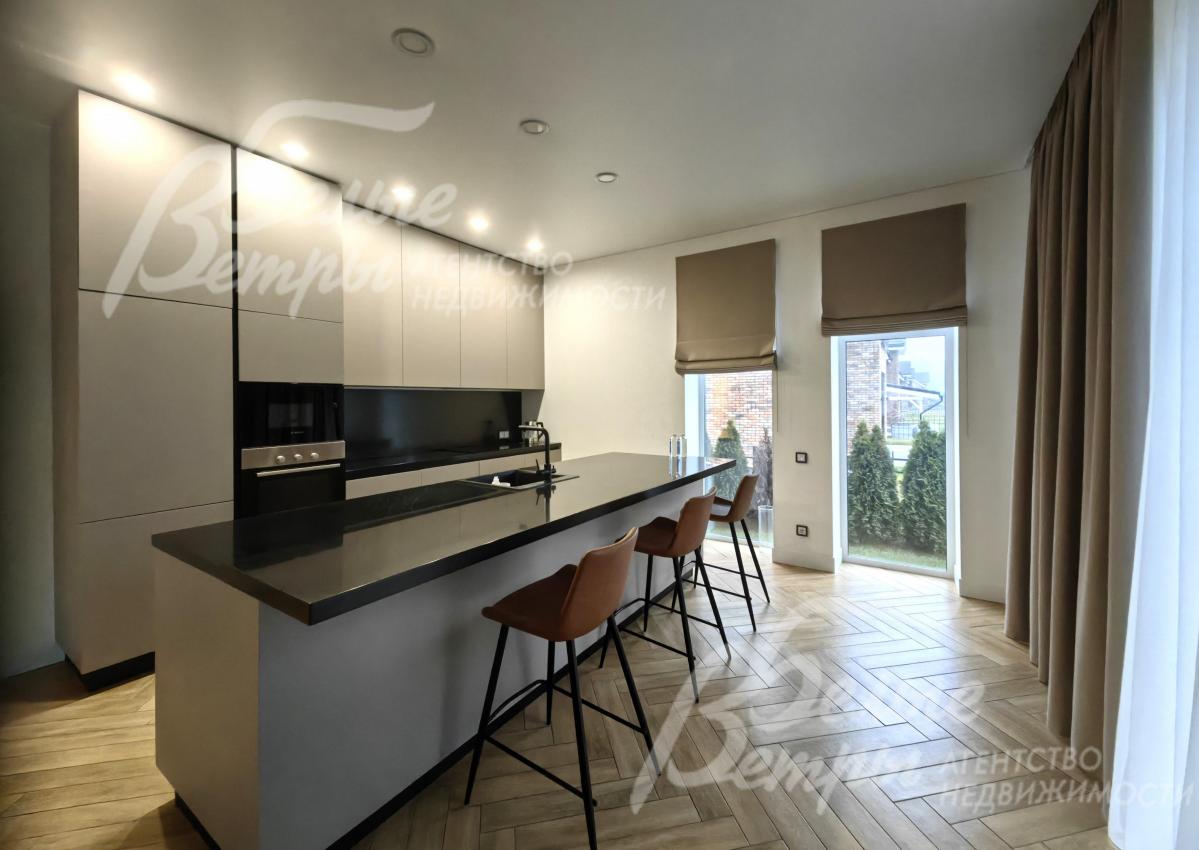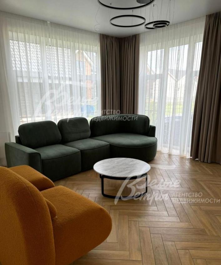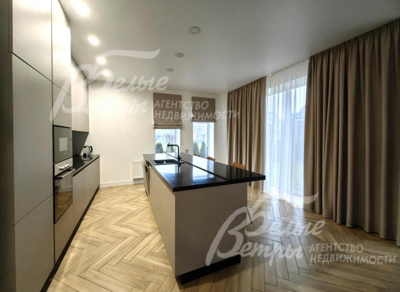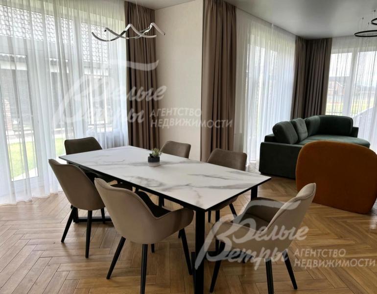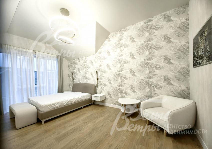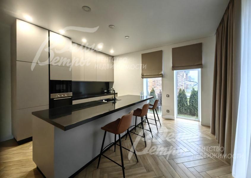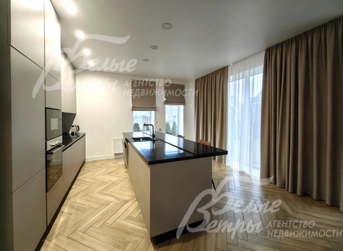 Мебель, оборудование: меблировка выдержана в единой стилистике: мягкая мебель в гостиной (диван и кресла), столовый гарнитур на 6 персон (стол и стулья), в одном стиле со стульями в столовой. В спальнях - большие и высокие двуспальные кровати с мягким изголовьем, гардеробные полностью оборудованы. Стильная кухня с большими островом и полу барным столом со стульями, с фасадами серого цвета, без ручек (современные удобные углубления для открывания) дверей шкафчиков, столешница и фартук черного цвета из искусственного камня. Встроенная техника BOSCH (духовой шкаф, СВЧ, варочная электрическая панель, посудомоечная машина). Стиральная машина - Beko; встроенный холодильник. Во всех помещениях шторы, тюль, люстры и различные светильники.