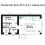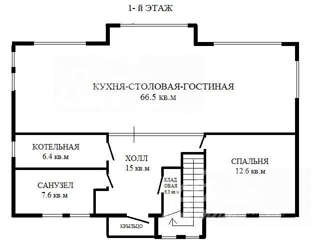 1-ый этаж: прихожая-холл 15 кв.м, гостевой санузел с душем 7.6 кв.м, кладовая-гардеробная 6 кв.м, кухня-гостиная-столовая 66.5 кв.м, спальня 12.6 кв.м, котельная 6.4 кв.м