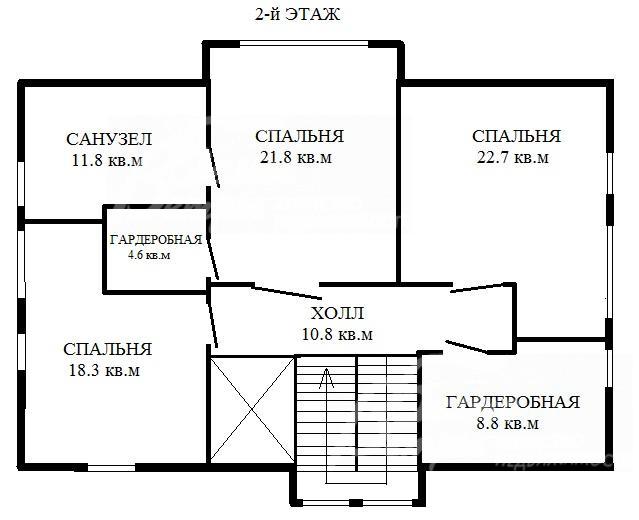 2-ой этаж: холл 11 кв.м, мастер-спальня 22 кв.м со своей гардеробной 4.6 кв.м и санузлом 12 кв.м (с ванной и душевой кабиной), две спальни 18 кв.м и 23 кв.м, гардеробная 9 кв.м