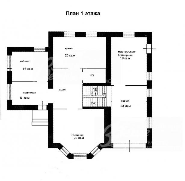 1-ый этаж: крыльцо, прихожая 4 кв.м, кабинет 16 кв.м, холл, с/у, кухня-столовая 20 кв.м, гостиная с эркером 22 кв.м, гараж на 1 м/м 23 кв.м (установлены автоматические ворота), бойлерная- мастерская 18 кв.м с отдельным выходом