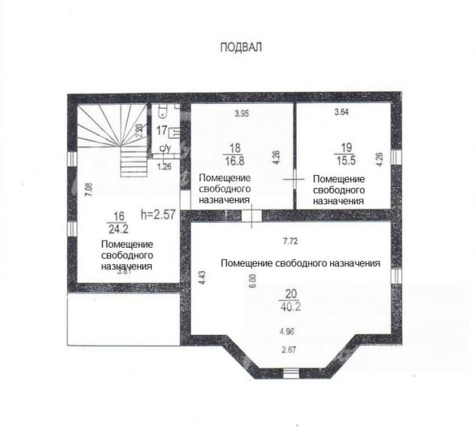 Цоколь: помещения свободного назначения, площади 40.2 кв.м, 16.8 кв.м, 15.5 кв.м, 24.2 кв.м, с/узел