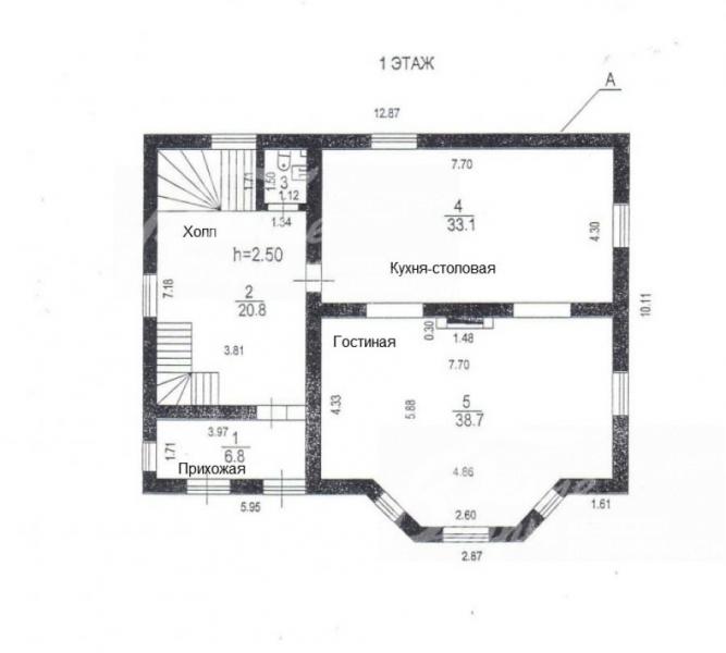 1-ый этаж: прихожая 6.8 кв.м, холл 20.8 кв.м, гостиная 38.7 кв.м, совмещенная с кухней-столовой 33.1 кв.м, с/узел
