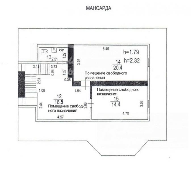 3-ий этаж: помещения свободного назначения, площади: 20.4 кв.м, 14.4 кв.м, 18.9 кв.м, с/узел