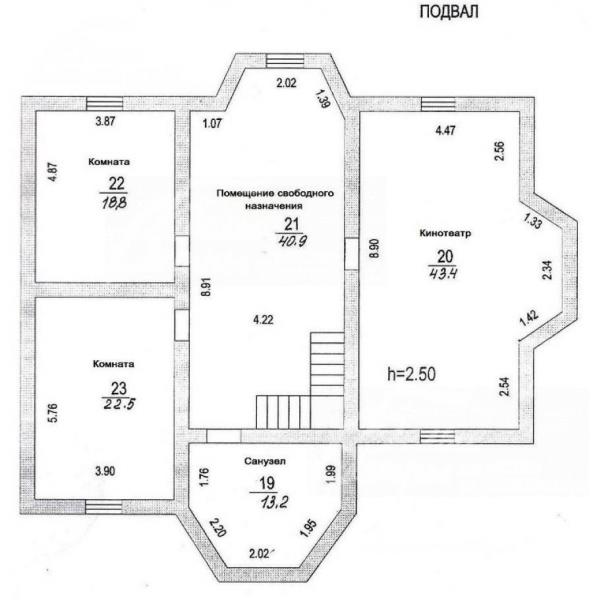 Цоколь: помещение свободного назначения 41 кв.м, кинотеатр 43 кв.м, комната 19 кв.м, комната 23 кв.м, санузел 13 кв.м