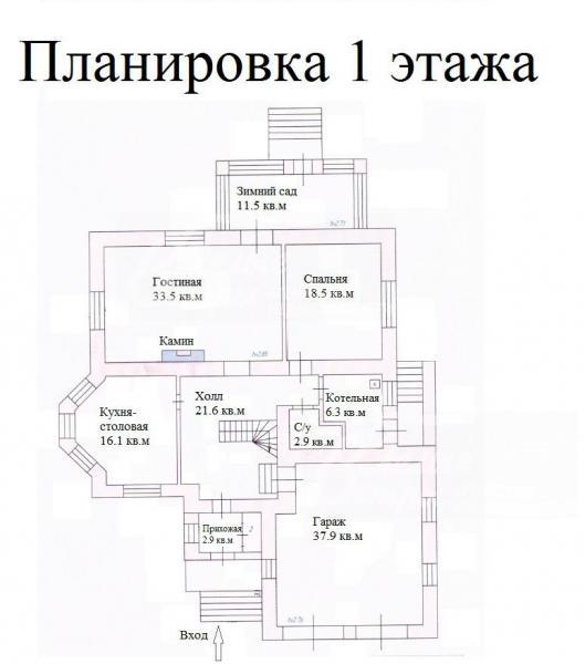 1-ый этаж: прихожая 3 кв.м, холл 22 кв.м, кухня-столовая 16 кв.м, гостиная с камином 34 кв.м, спальня 19 кв.м, зимний сад 12 кв.м, котельная 6 кв.м, с/у 3 кв.м, гараж на 2 а/м 38 кв.м