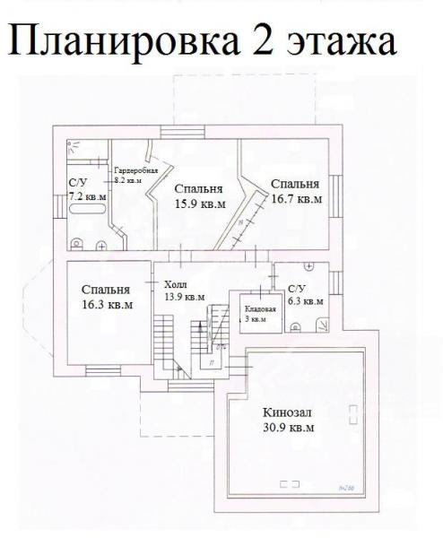 2-ой этаж: хозяйская спальня 16 кв.м с гардеробной 8 кв.м и с/у 7 кв.м, спальня 17 кв.м, спальня 16 кв.м, с/у 6 кв.м, кладовая, кинозал 31 кв.м