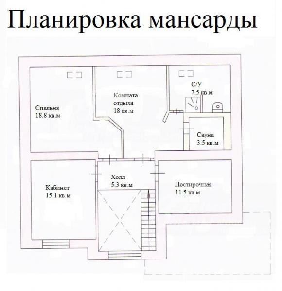 3-ий этаж: спальня 19 кв.м, спальня-кабинет 15 кв.м, постирочная 12 кв.м, сауна 4 кв.м, с/у 8 кв.м, комната отдыха 18 кв.м