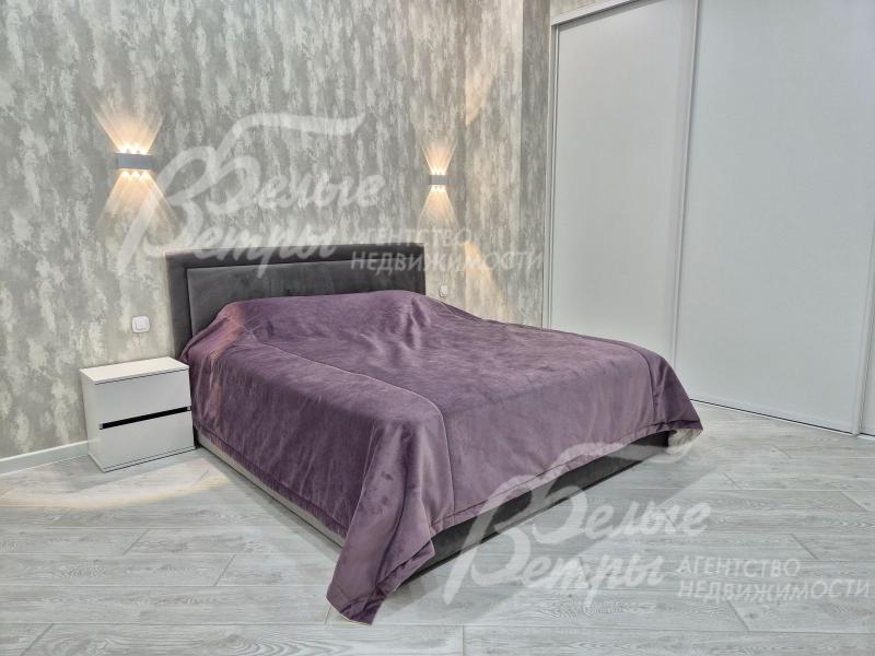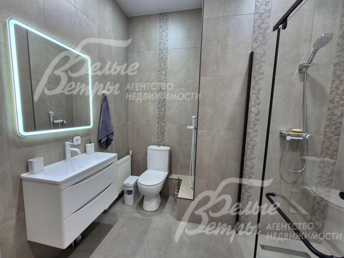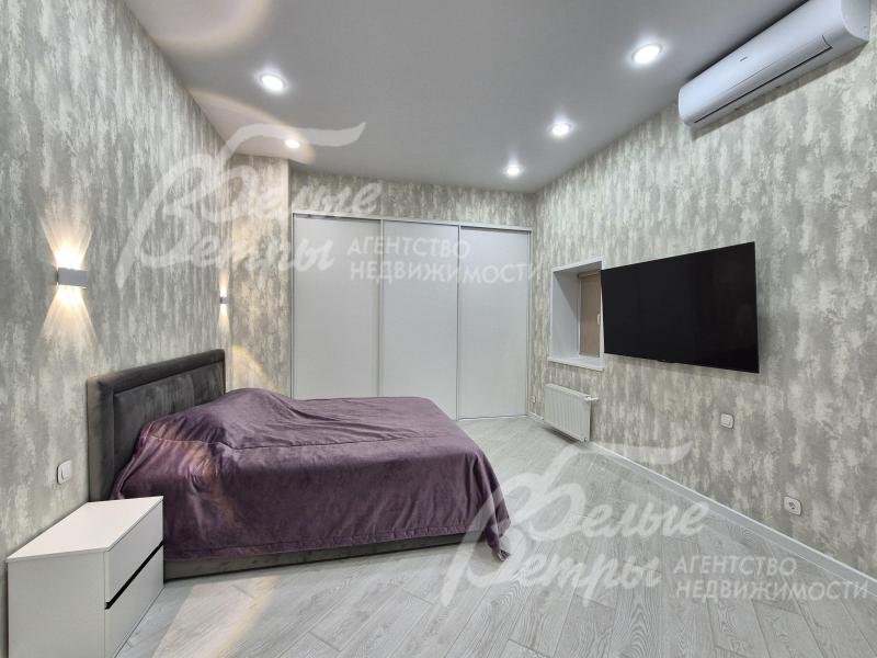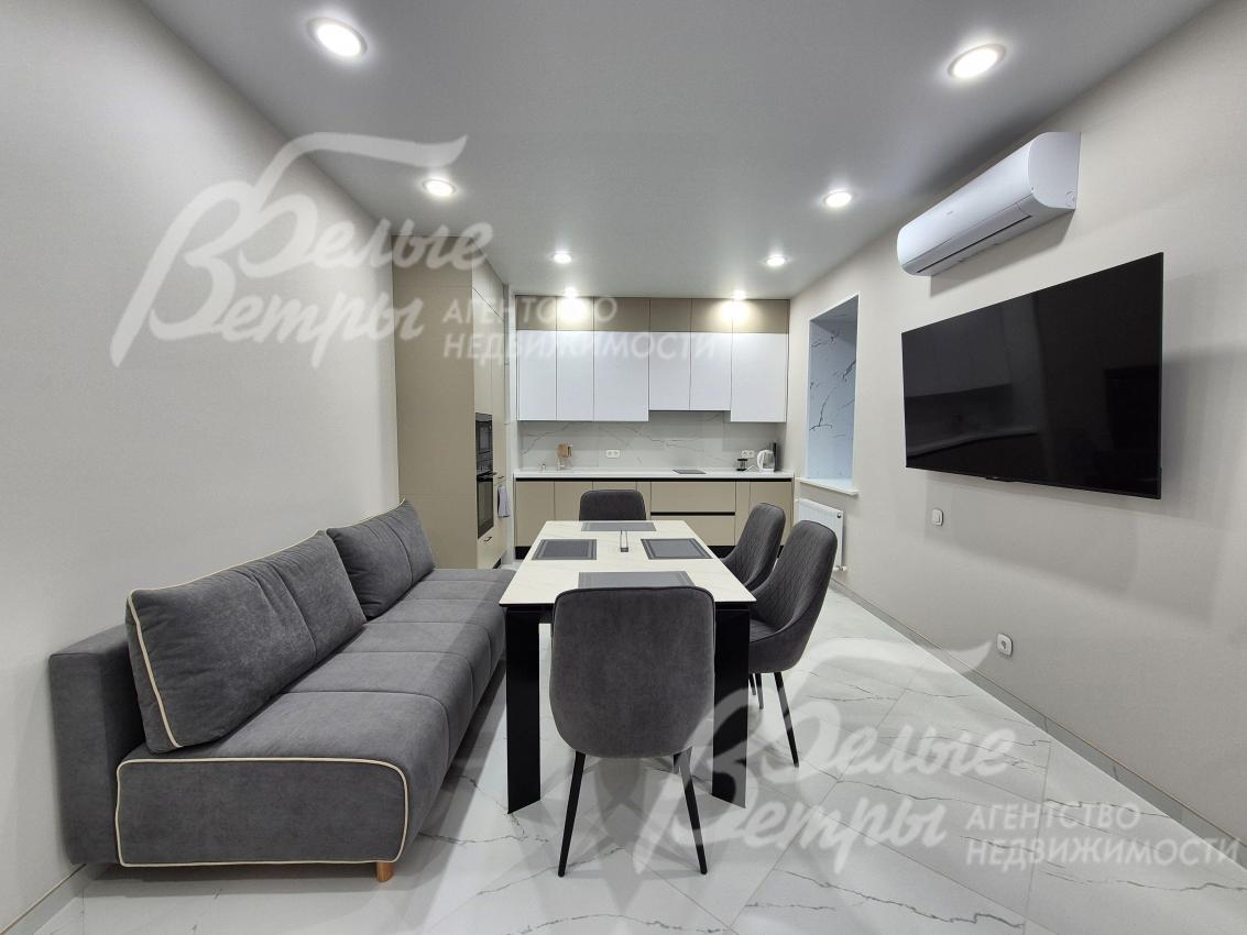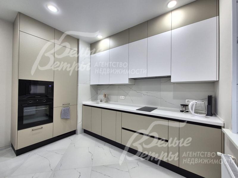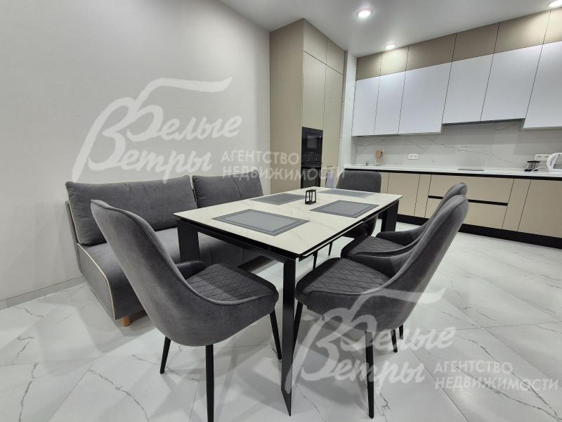 Мебель, оборудование: угловой кухонный гарнитур со встроенной техникой: электрическая варочная панель, духовой шкаф, микроволновая печь и холодильник Kuppersberg, посудомоечная машина (60см), двухкамерный холодильник. Стиральная машина на 7.5 кг, телевизоры 65 дюймов в гостиной и спальне. Обеденная группа на 6-8 персон, в гостиной диван, в комнате двуспальная кровать с тумбами, встроенные вместительные шкафы-купе, в т.ч. с зеркалами. Встроенные потолочные споты, стильные настенные бра.
