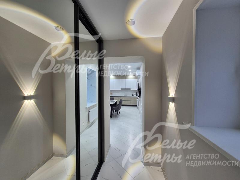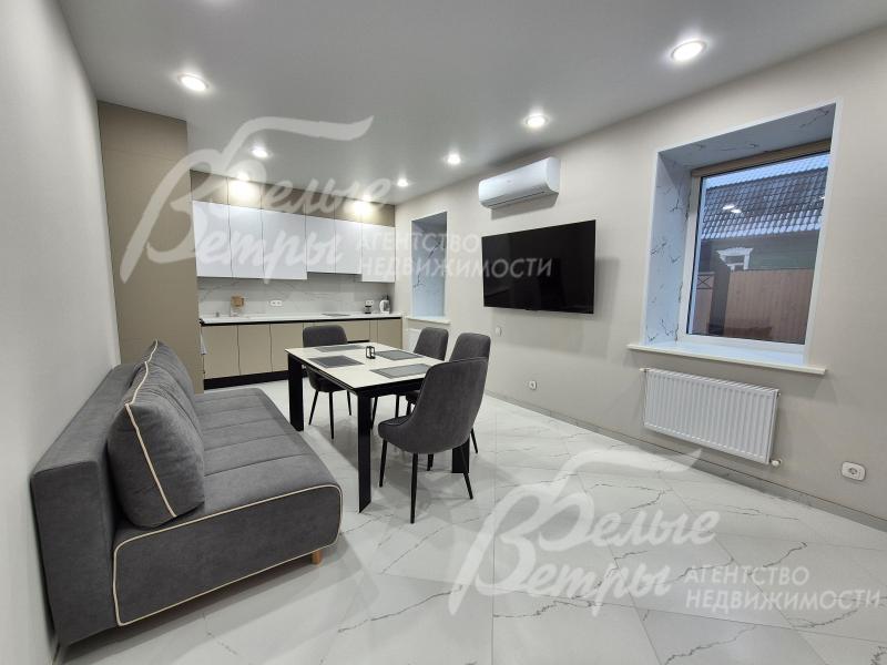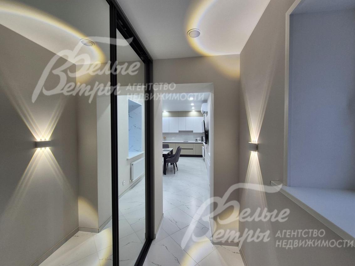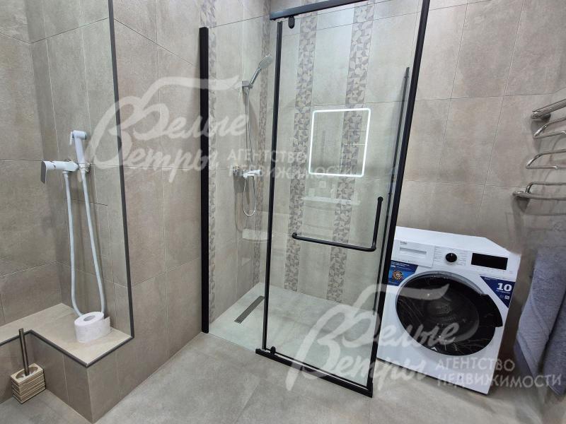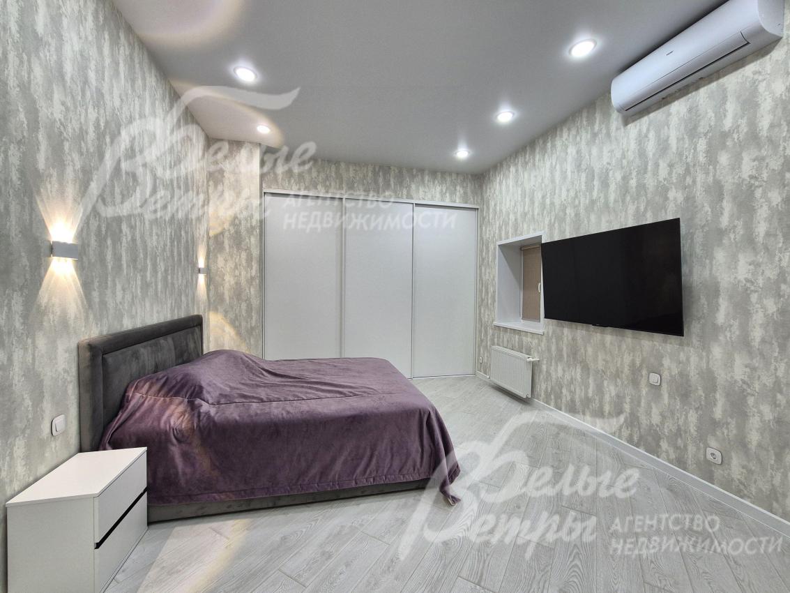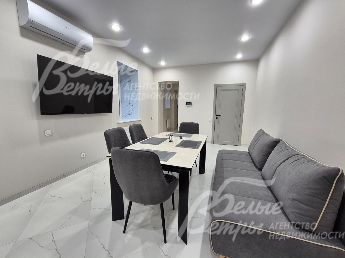 Мебель, оборудование: угловой кухонный гарнитур со встроенной техникой: электрическая варочная панель, духовой шкаф, микроволновая печь и холодильник Kuppersberg, посудомоечная машина (60см), двухкамерный холодильник. Стиральная машина на 7.5 кг, телевизоры 65 дюймов в гостиной и спальне. Обеденная группа на 6-8 персон, в гостиной диван, в комнате двуспальная кровать с тумбами, встроенные вместительные шкафы-купе, в т.ч. с зеркалами. Встроенные потолочные споты, стильные настенные бра.