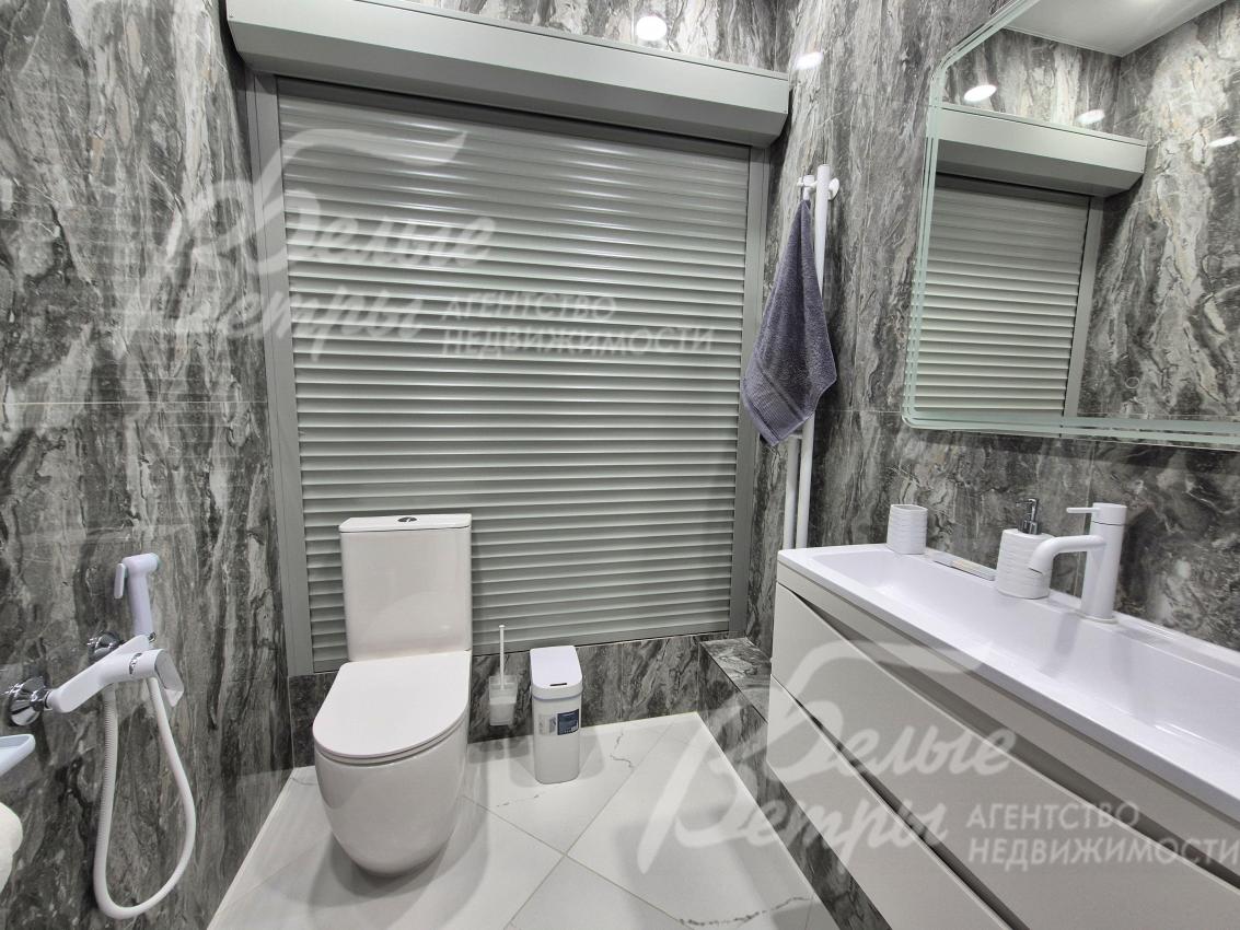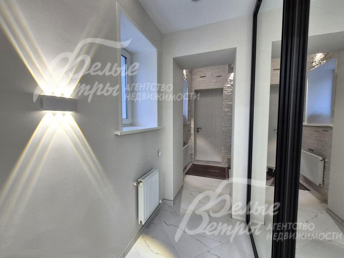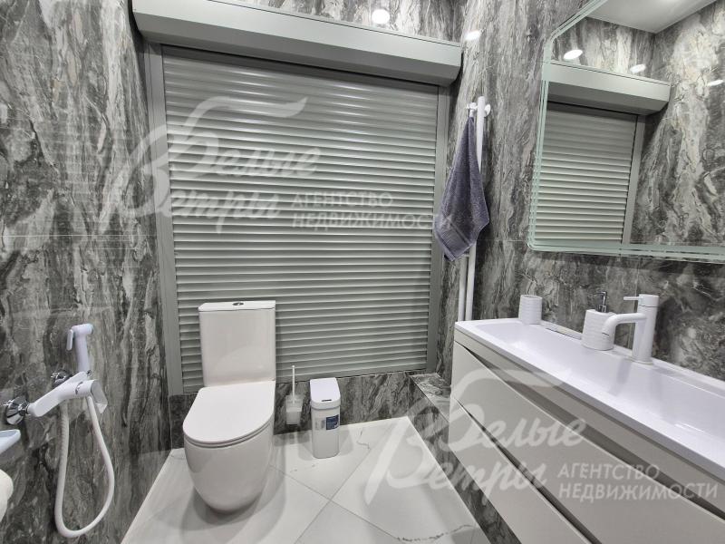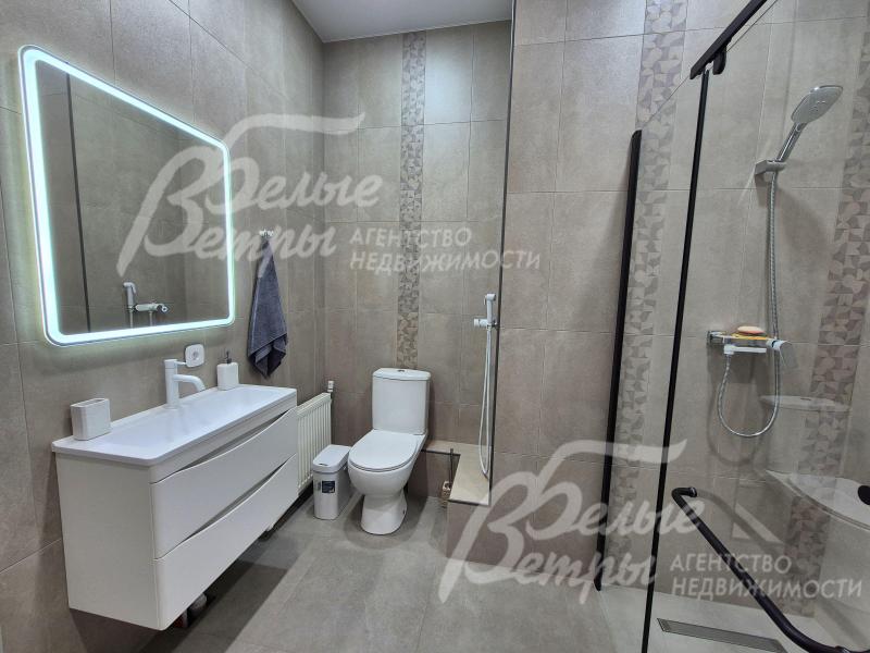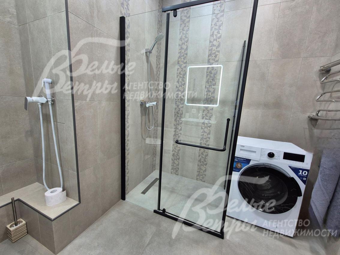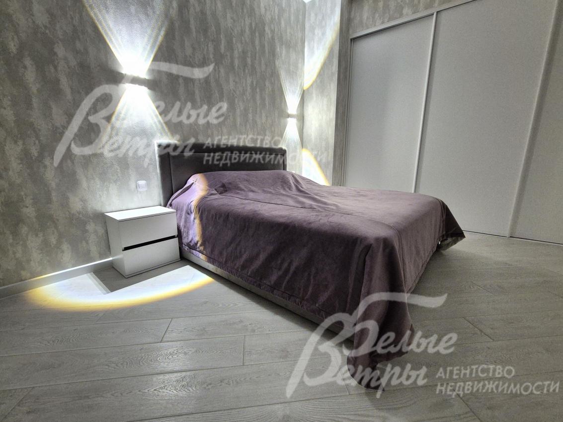 Мебель, оборудование: угловой кухонный гарнитур со встроенной техникой: электрическая варочная панель, духовой шкаф, микроволновая печь и холодильник Kuppersberg, посудомоечная машина (60см), двухкамерный холодильник. Стиральная машина на 7.5 кг, телевизоры 65 дюймов в гостиной и спальне. Обеденная группа на 6-8 персон, в гостиной диван, в комнате двуспальная кровать с тумбами, встроенные вместительные шкафы-купе, в т.ч. с зеркалами. Встроенные потолочные споты, стильные настенные бра.