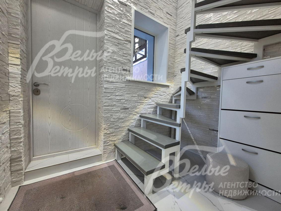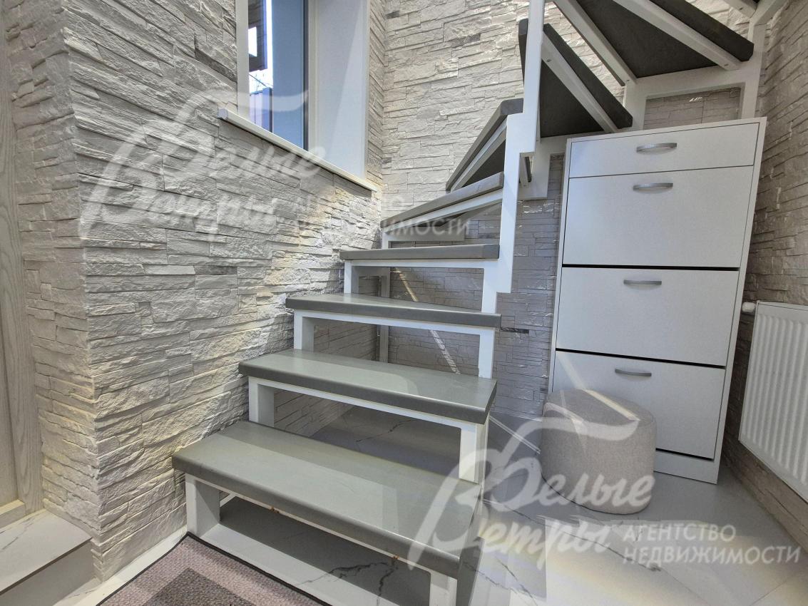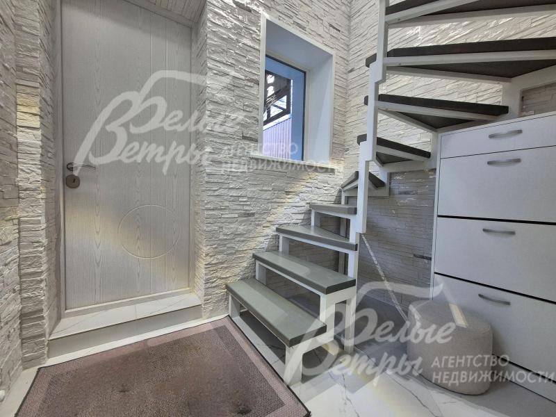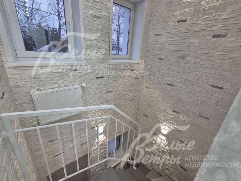 Описание внутренней отделки: в современном минималистичном стиле. На стенах: обои, штукатурка под покраску, искусственный камень; полы: на первом этаже плитка с системой "теплый пол", на втором этаже ламинатная доска; потолки: натяжные, со встроенным освещением. Лестница на металлическом каркасе шириной 82 см, ступени облицованы массивом дерева, глубина/высота ступеней 24/20см
