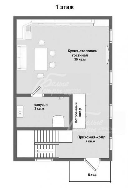 1-ый этаж: холл/прихожая 7 кв.м, кухня/столовая/гостиная 30 кв.м, санузел 3 кв.м