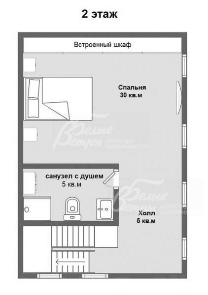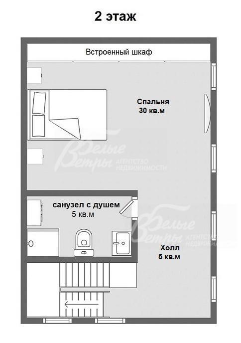 2-ой этаж: холл 5 кв.м, спальня 30 кв.м, санузел с душевой 5 кв.м