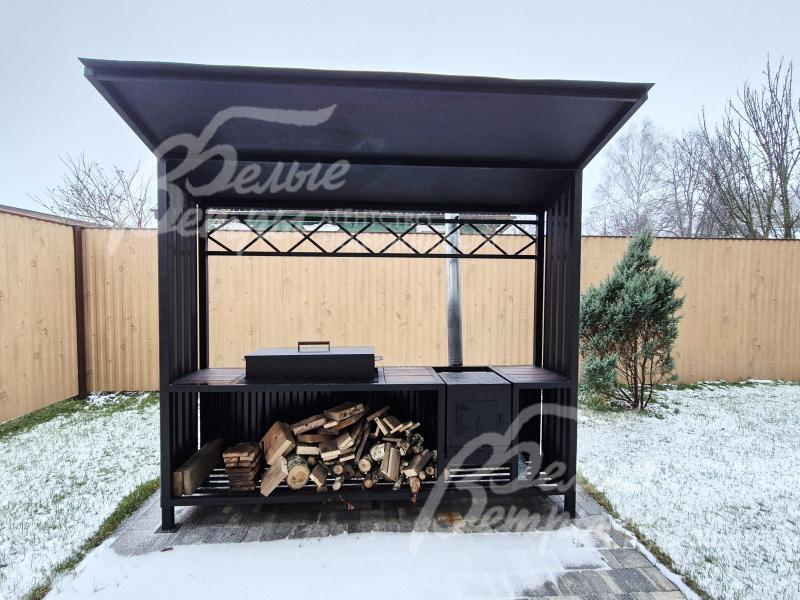 Благоустройство участка: газон, куртины можжевельника, декоративные кустарники, зона барбекю