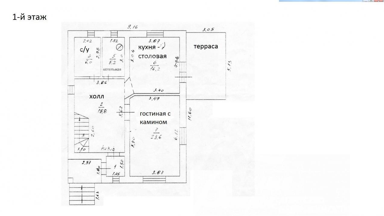 1-ый этаж: холл 18.8 кв.м, санузел 6 кв.м, котельная 5.2 кв.м, кухня-столовая 16.2 кв.м, гостиная с камином 23.6 кв.м, открытая терраса 15 кв.м