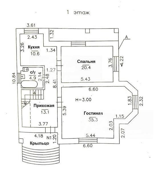 1-ый этаж: большое крытое крыльцо, прихожая, гостиная-столовая с декоративным камином, кухня, спальня, санузел (с окном и ванной)