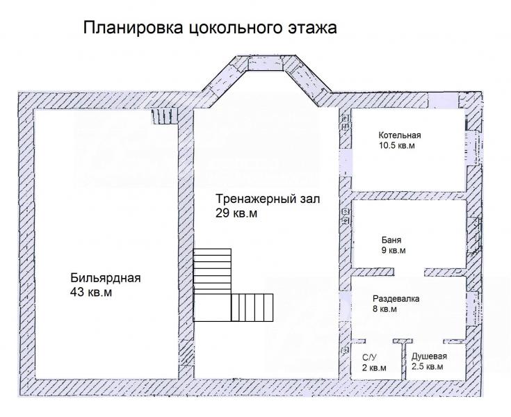 Цоколь: тренажерный зал 29 кв.м, бильярдная 43 кв.м, раздевалка 8 кв.м, санузел 2 кв.м, душевая 3 кв.м, баня 9 кв.м, котельная 11 кв.м