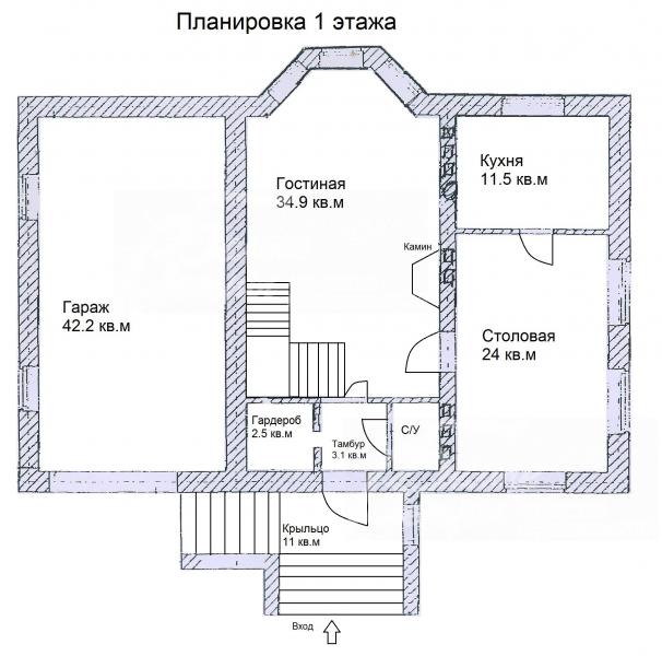 1-ый этаж: крыльцо 11 кв.м, тамбур 3 кв.м, гардероб 3 кв.м, санузел, гостиная 35 кв.м, кухня 12 кв.м, столовая 24 кв.м