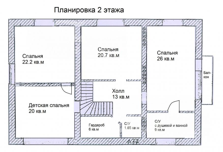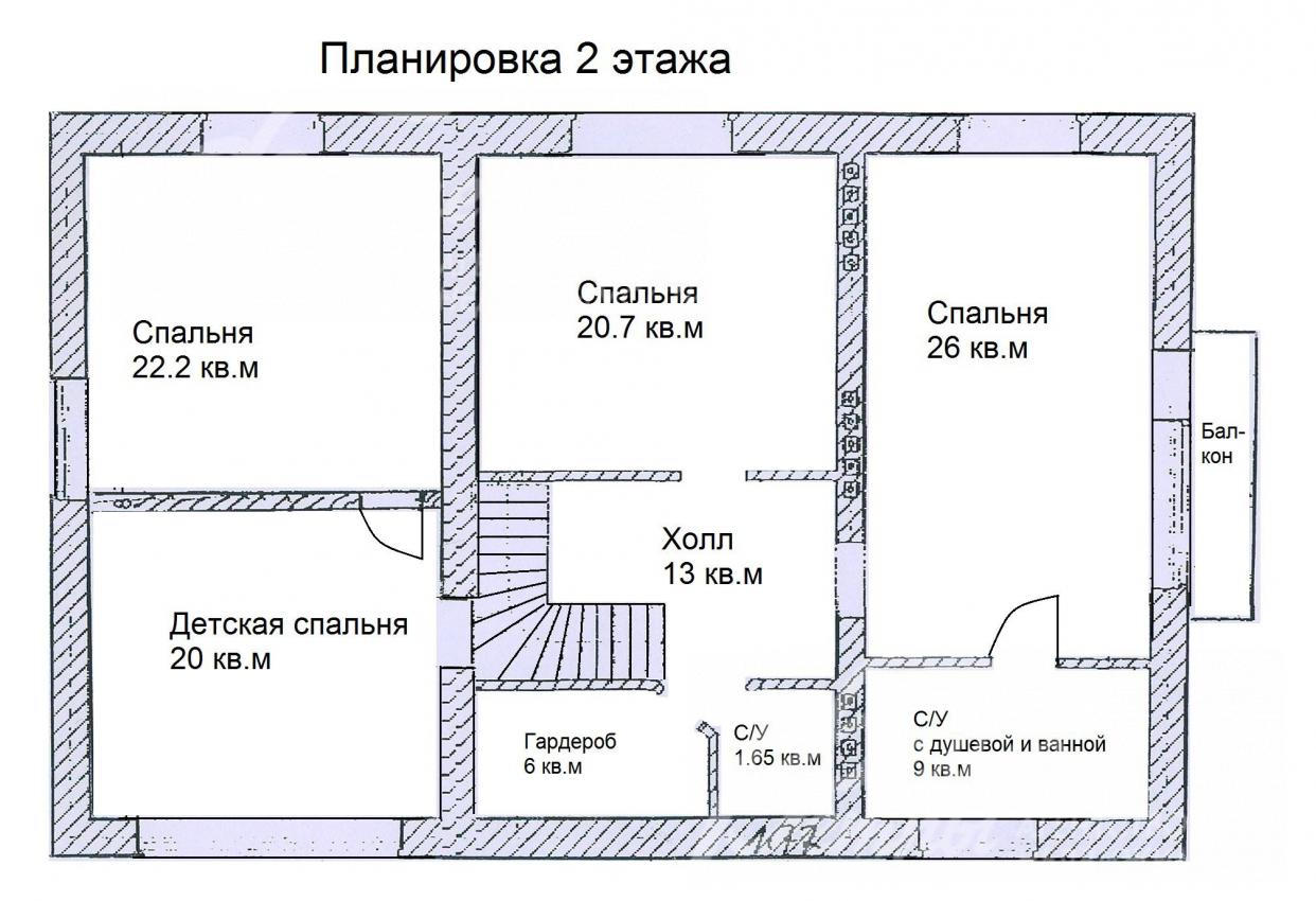 2-ой этаж: холл 13 кв.м, спальня 21 кв.м, гардероб 6 кв.м, спальня 22 кв.м, санузел 2 кв.м, детская спальня 20 кв.м, санузел с душевой и ванной 9 кв.м, спальня 26 кв.м