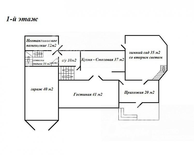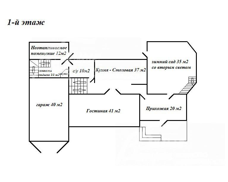 1-ый этаж: прихожая 20 кв.м, зимний сад со вторым светом 35 кв.м, кухня-столовая 37 кв.м, гостиная 41 кв.м, с/узел 10.5 кв.м, комната отдыха с сауной 10 кв.м, холодная комната 12 кв.м, гараж 40 кв.м