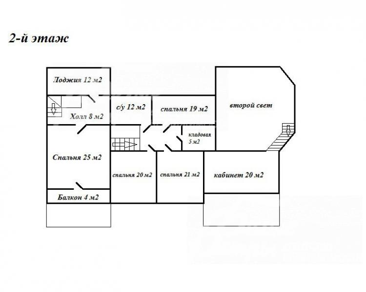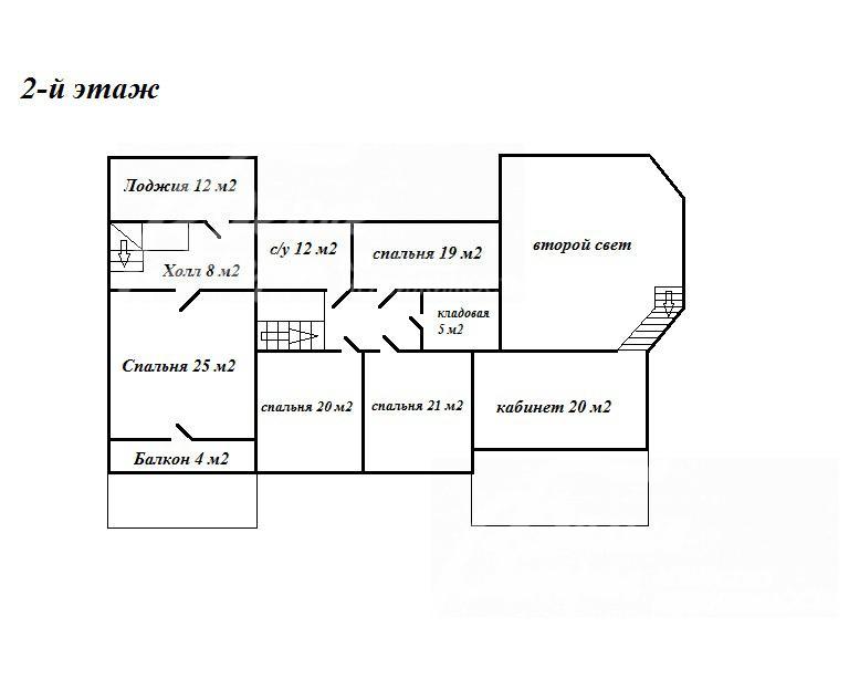 2-ой этаж: спальня 25 кв.м с балконом, спальня 21 кв.м, спальня 20 кв.м, спальня 19 кв.м, кабинет 20 кв.м, гардеробная 5 кв.м, коридор 5 кв.м, холл 10 кв.м, лоджия 12 кв.м