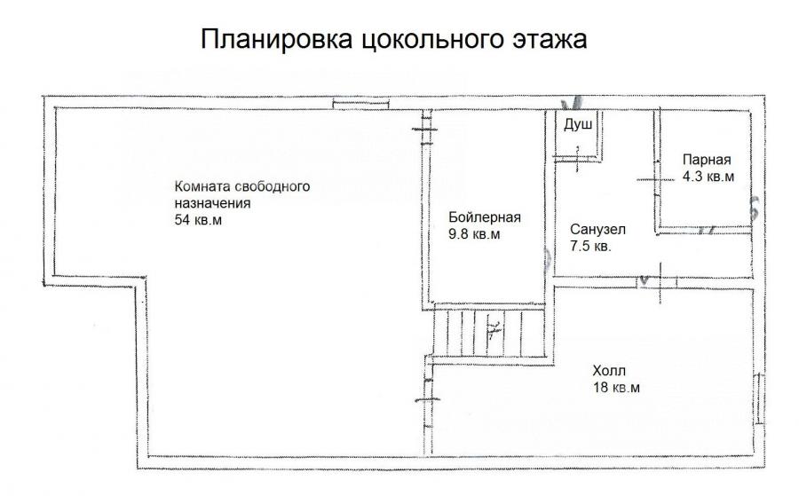 Цоколь: холл 18 кв.м, комната свободного назначения 54 кв.м, санузел с душевой 8 кв.м, парная 4 кв.м, бойлерная 9.8 кв.м