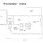 1-ый этаж: гараж на 1 м/м 18 кв.м, тамбур 3 кв.м, прихожая с гардеробной 5 кв.м, помещение свободного назначения (холл с окнами и эркером) 12 кв.м, кухня 19 кв.м, гостиная-столовая 34 кв.м с выходом на террасу 20 кв.м, санузел гостевой неполный 2 кв.м, постирочная
