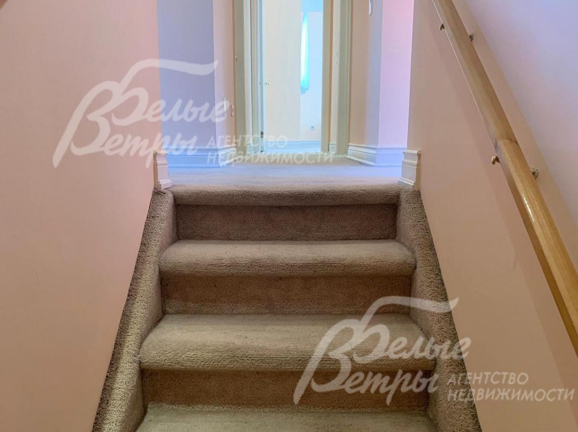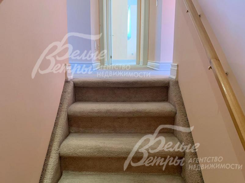 Описание внутренней отделки: спокойная светлая отделка в классическом стиле. Пол - паркет в гостиной, ламинат, в спальнях - ковролин, в санузлах и на кухне - плитка. Стены окрашены. Белые межкомнатные двери. Ж/б лестничный марш - обшит деревом, сверху - ковролин.