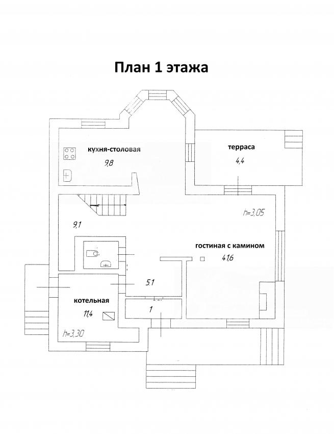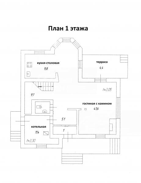 1-ый этаж: котельная 10,1 кв.м с отдельным входом с улицы, тамбур 6 кв.м, холл 16 кв.м, с/узел 3 кв.м с душевой, постирочная 8 кв.м, кабинет 21 кв.м, холл 12 кв.м, кухня-столовая 36 кв.м, гостиная с камином 37 кв.м и с выходом на веранду