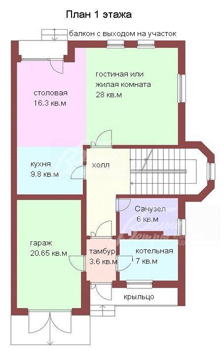 1-ый этаж: гараж 20.6 кв.м, тамбур 3.6 кв.м, котельная 7 кв.м, санузел 6 кв.м, холл 20 кв.м, кухня 9.7 кв.м объединенная со столовой 16.2 кв.м, жилая комната 28 кв.м, холл 19.9 кв.м