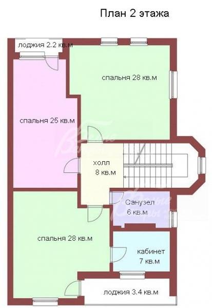 2-ой этаж: холл 8.3 кв.м, с/у 6 кв.м, спальня 27.9 кв.м с выходом на лоджию 3.3 кв.м и кабинетом 7 кв.м, спальня 24.5 кв.м с выходом на лоджию 2.2 кв.м, спальня 28.2 кв.м