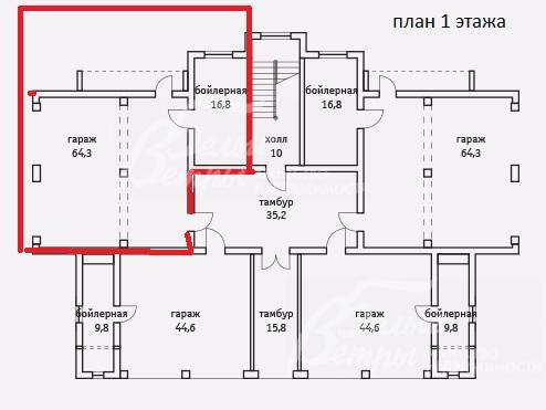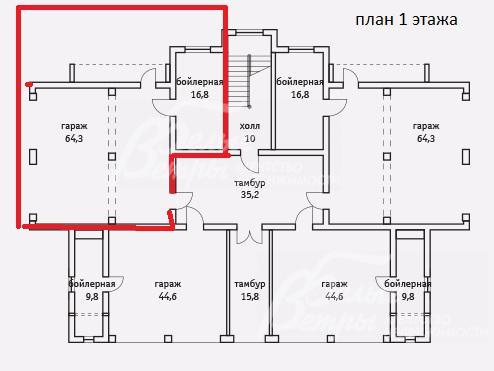1-ый этаж: гараж 64 кв.м с выходом в сад и в общий коридор, бойлерная 17 кв.м с окном