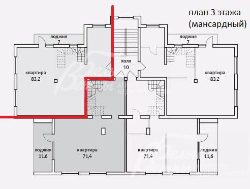 3-ий этаж: помещение свободной планировки. Вариант планировки: 3 комнаты, лоджия 8 кв.м, гардеробная, с/узел