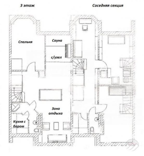 3-ий этаж: кухня с баром, спальня, зона отдыха с сауной, с/узел
