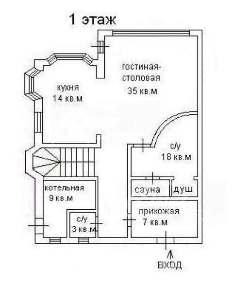 1-ый этаж: прихожая 7 кв.м, кухня-столовая 14 кв.м, гостиная 35 кв.м, сауна 18 кв.м, с/узел, кладовая 6 кв.м
