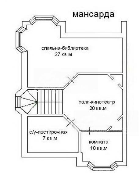 3-ий этаж: Холл (кинотеатр) 20 кв.м, библиотека-спальня с электрокамином 27 кв.м, жилая комната 10 кв.м, с/узел-постирочная 7 кв.м
