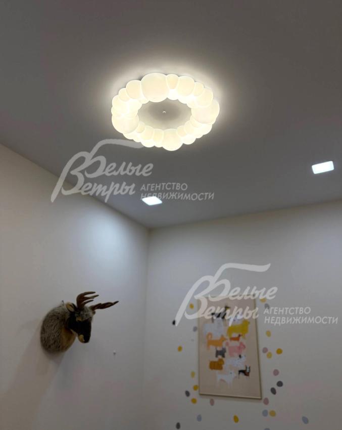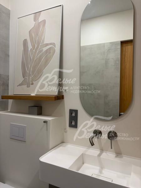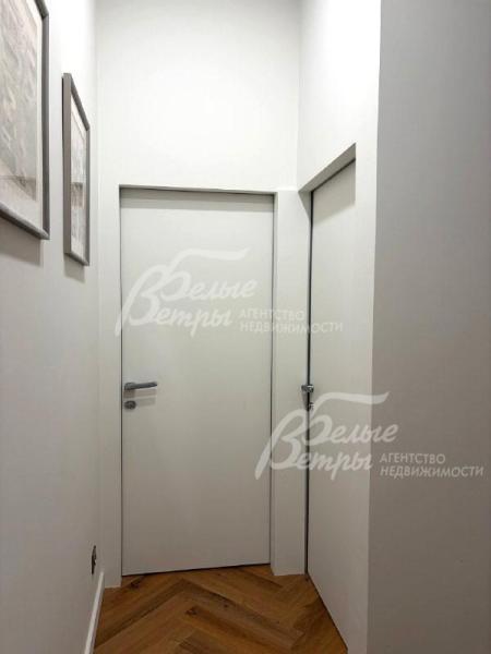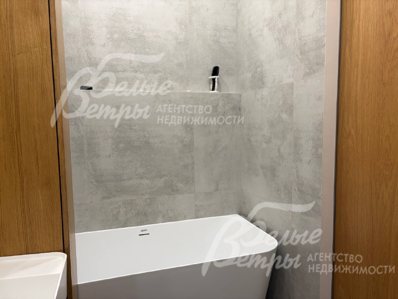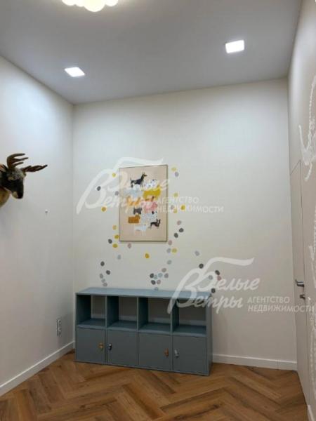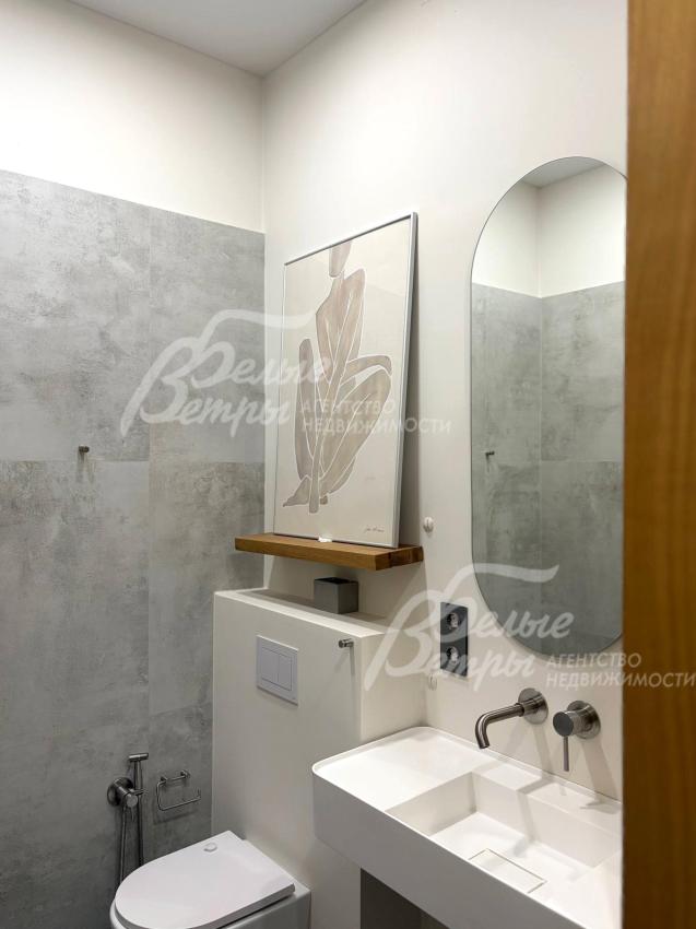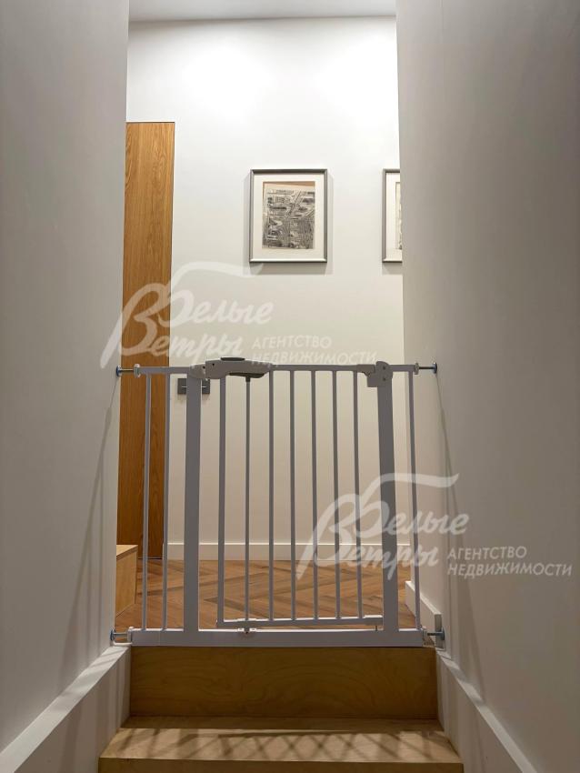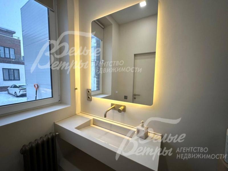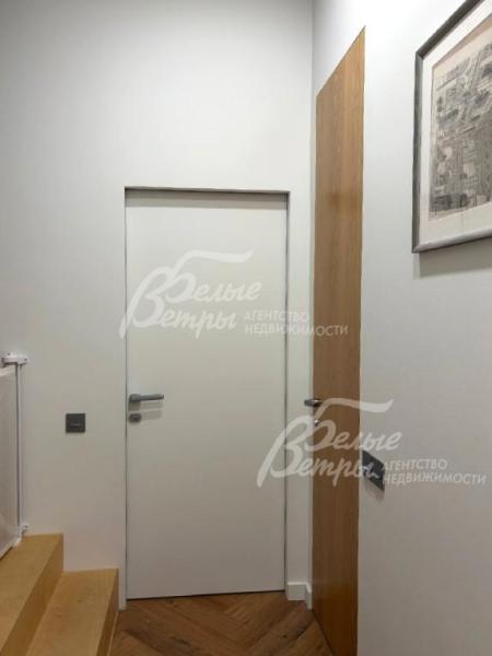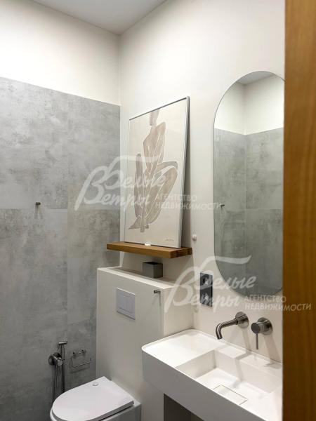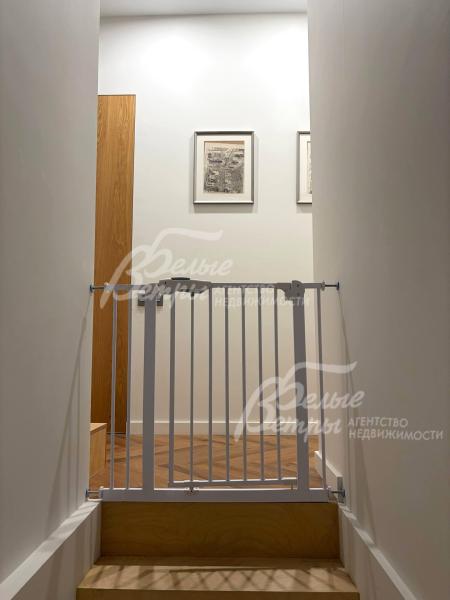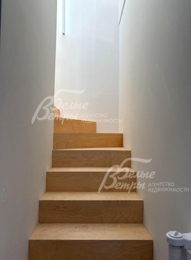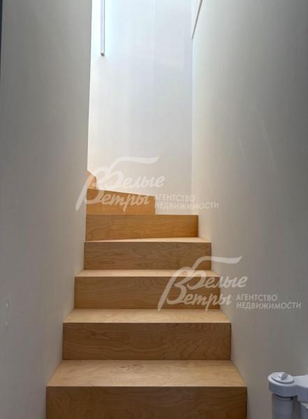 Описание внутренней отделки: в доме выполнена стильная отделка с использованием высококачественных современных материалов. На стенах – штукатурка, шпаклёвка и краска Flugger (Дания), в санузлах тёплые стены (вместо полотенцесушителей) облицованы лаппатированной плиткой Laparet размером 120×60 см. На первом этаже пол выполнен из инженерной доски (дуб), на втором — из кварцвинилового ламината: в прихожей и санузлах предусмотрены тёплые водяные полы. Потолки — натяжные, матовые. Выключатели и подрозетники – в едином стиле, в разной цветовой гамме по этажам — белые, золотистые и серебристые; на третьем уровне также проведено электричество и установлены розетки. Установлены радиаторы Home Heat в цветах каждого этажа. Входная дверь произведена компанией «Двери регионов», межкомнатные — скрытые двери «Терем» под покраску, в санузле на втором этаже установлена нестандартная высокая дверь, шпонированная под дуб. Подоконники выполнены из бетона и окрашены. Лестница на второй этаж – на металлокаркасе, обшита фанерой и покрыта матовым прозрачным лаком. На третьем уровне возведены междомовые перегородки. После ремонта сохранены остатки материалов, а также вся документация по сметам и колерам красок