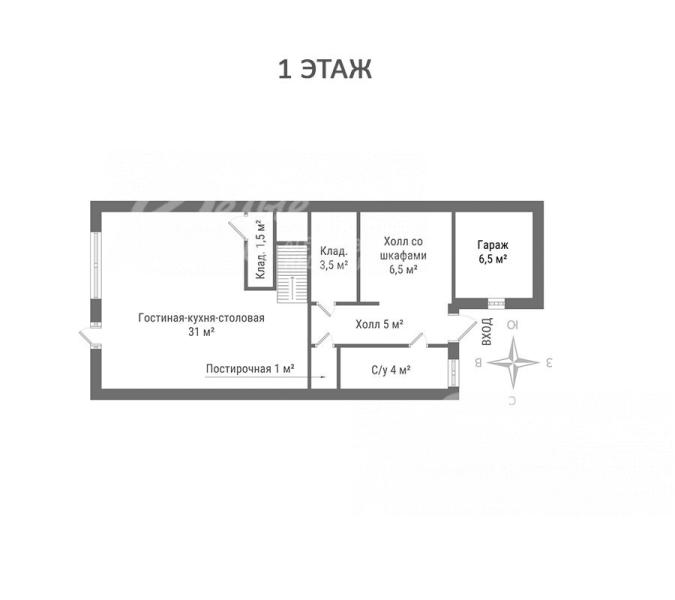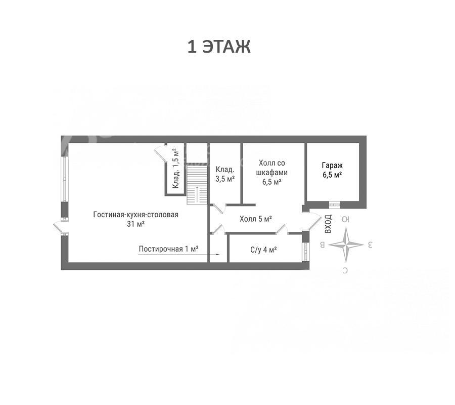 1-ый этаж: холл 5 кв.м, холл со шкафами 6.5 кв.м, гостиная-кухня-столовая 31 кв.м с выходом на участок, кладовая 3.5 кв.м, кладовая 1.5 кв.м, санузел с душем 4 кв.м, постирочная 1 кв.м, гараж 6.5 кв.м