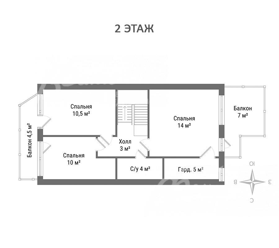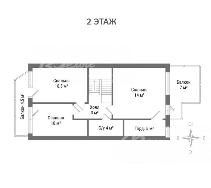 2-ой этаж: холл 3 кв.м, спальня 10.5 кв.м с выходом на балкон 4.5 кв.м, спальня 10 кв.м с выходом на балкон 4.5 кв.м, спальня 14 кв.м с выходом на балкон 7 кв.м, гардеробная 5 к.м, санузел с ванной 4 кв.м