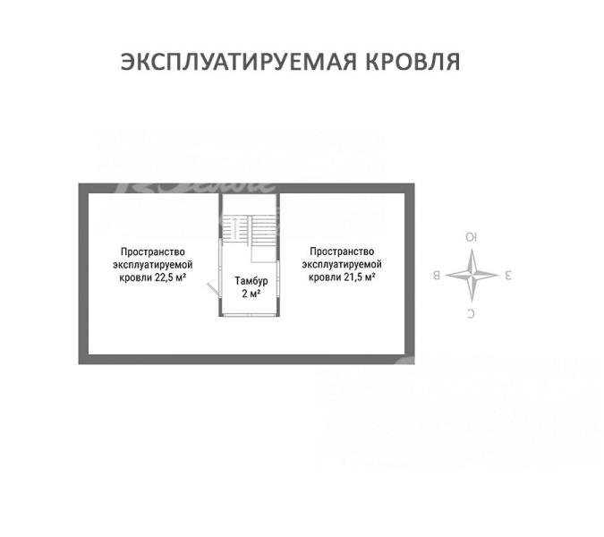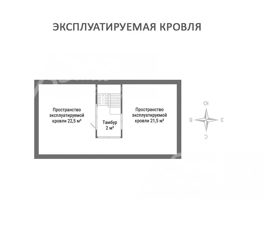 3-ий этаж: тёплый тамбур 2 кв.м с выходом на эксплуатируемую кровлю общей площадью 49.5 кв.м, состоящей из двух соединенных между собой пространств - 21.5 кв.м и 22.5 кв.м