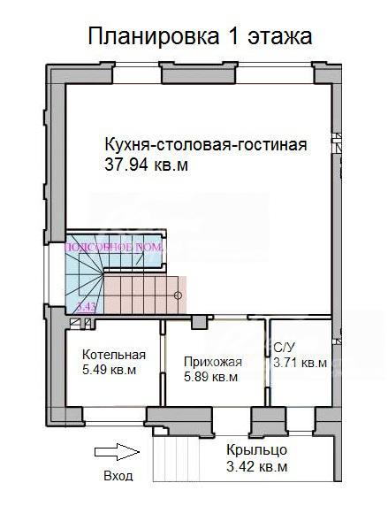 1-ый этаж: крыльцо 3 кв.м, прихожая 6 кв.м, кухня-столовая-гостиная 38 кв.м, санузел 4 кв.м, котельная 6 кв.м