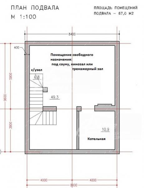 Цоколь: помещение свободного назначения 49 кв.м: под сауну, бильярдную или тренажерный зал, с/узел 6.8 кв.м, бойлерная 11 кв.м.