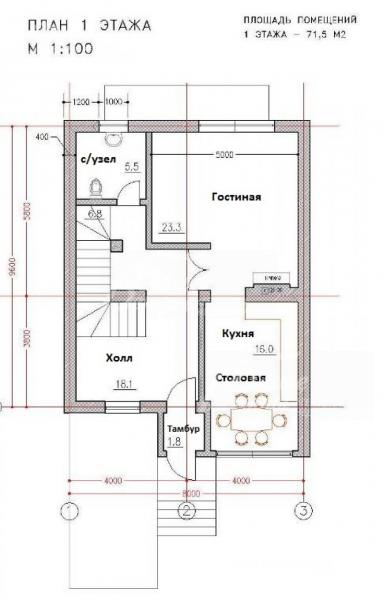 1-ый этаж: тамбур 2 кв.м, холл 18 кв.м, гостиная с камином 23 кв.м, кухня-столовая 16 кв.м, с/узел 5.5 кв.м