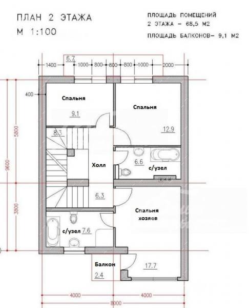 2-ой этаж: холл 6 кв.м, хозяйская спальня 17 кв.м с балконом и с/узлом 7.6 кв.м, спальня 13 кв.м, с/узел 6.6 кв.м, спальня/кабинет 9 кв.м