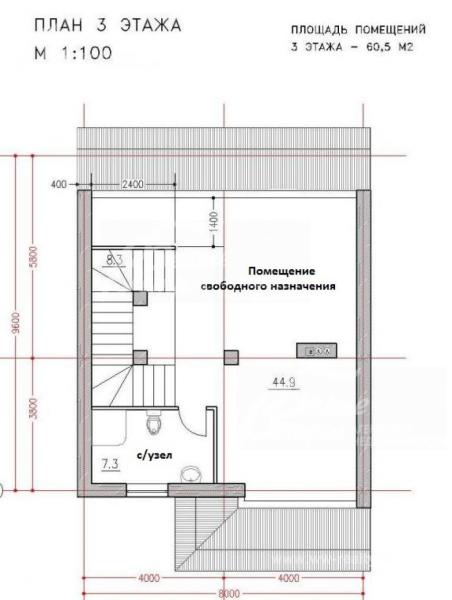 3-ий этаж: мансарда - помещение свободного назначения 45 кв.м, с/узел 7 кв.м