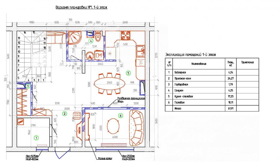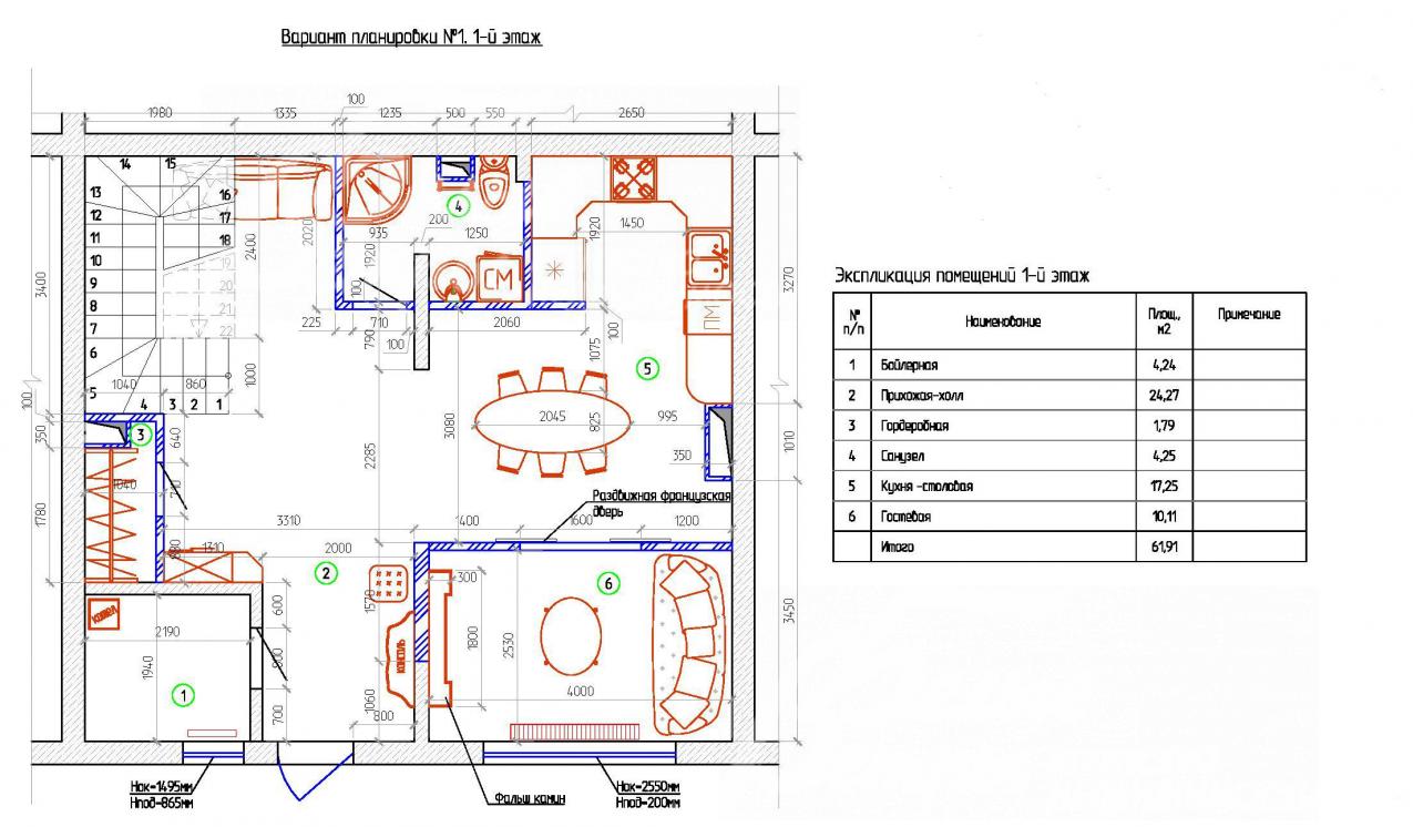 1-ый этаж: помещение свободной планировки 62 кв.м. Пример планировки: прихожая-холл 14 кв.м, с/у 4 кв.м, кухня-столовая 17 кв.м, гостиная 10 кв.м, бойлерная, спальня/кабинет 10 кв.м