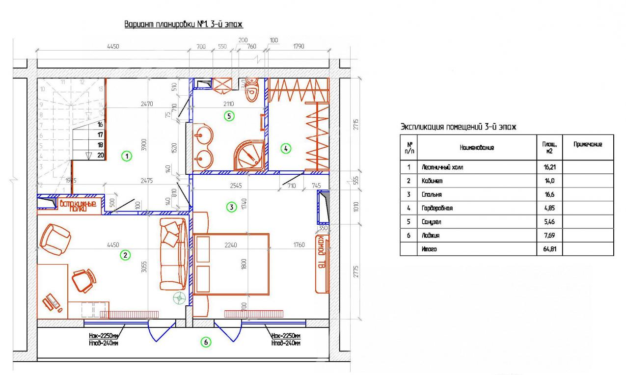 3-ий этаж: помещение свободной планировки 65 кв.м. Пример планировки: холл 16 кв.м, спальня с балконом 14 кв.м, спальня 16,6 кв.м, гардеробная 5 кв.м, с/у 5.5 кв.м
