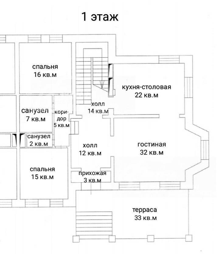 1-ый этаж: прихожая 3 кв.м, холл 12 кв.м, гостиная 32 кв.м с выходом на крытую террасу 33 кв.м, кухня-столовая 22 кв.м, спальня 16 кв.м, спальня/кабинет 15 кв.м, санузел 7 кв.м, коридор 5 кв.м, санузел 2 кв.м, лестничный холл 14 кв.м