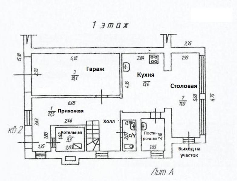 1-ый этаж: гараж 18 кв.м, прихожая 17.5 кв.м, котельная 3.3 кв.м, постирочная 3.6 кв.м, с/узел, кухня 13.5 кв.м, столовая 11 кв.м с выходом на участок